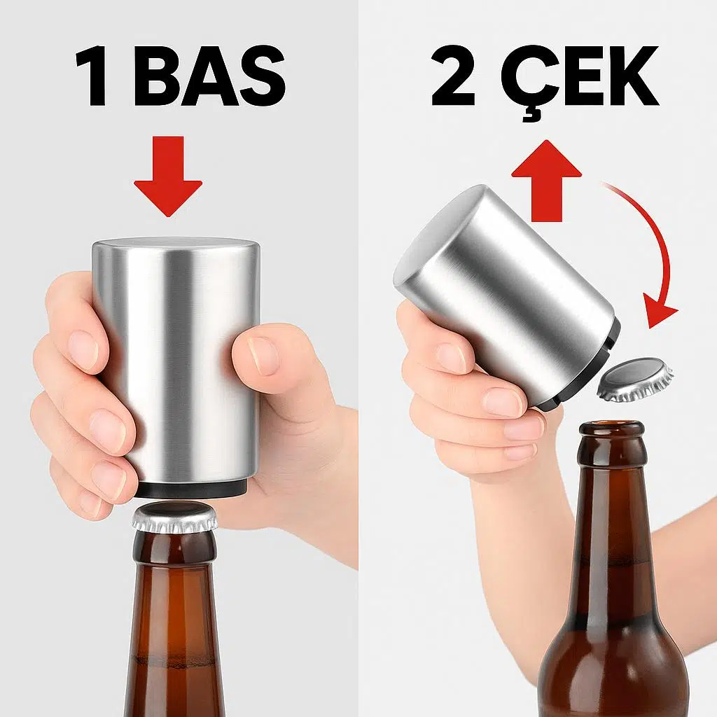 PLASTİK DEĞİL METAL KASA Piyasada benzer görünen birçok şişe açacağı var; ancak bu ürün orijinal tasarım ve materyal kalitesi sayesinde hem kullanımda hem dayanıklılıkta rakiplerinin çok önüne geçer. Gövdesi metal paslanmazdır iç aksamı ise metal ve darbelere dayanıklı premium plastik bileşenlerden üretilmiştir. Eğilmez, esnemez, kırılmaz — uzun yıllar kullanıma uygundur.